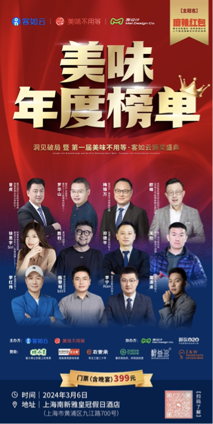 3月6日,由客如云·美味不用等主辦發(fā)起,麥設(shè)計(jì)和餐飲O2O共同協(xié)辦的“洞見(jiàn)破局 暨 第一屆客如云·美味不用等頒獎(jiǎng)盛典”在上海成功舉辦,在2024全新開(kāi)局之年,開(kāi)啟一場(chǎng)洞見(jiàn)餐飲破局之道。在活動(dòng)現(xiàn)場(chǎng),有資深餐飲行業(yè)專(zhuān)家、餐飲媒體網(wǎng)、數(shù)字化科技行業(yè)等頂級(jí)大佬,攜手近300余家商戶(hù)代表齊聚上海,共同探討餐飲行業(yè)未來(lái)大勢(shì)。