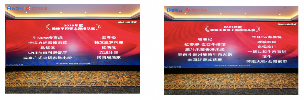 活動(dòng)現(xiàn)場(chǎng),客如云·美味不用等公布【2023年度美味不用等上海排隊(duì)王】和【2023年度美味不用等上海本地頭牌】,并在現(xiàn)場(chǎng)為相關(guān)獲獎(jiǎng)餐飲品牌頒發(fā)榮譽(yù)獎(jiǎng)牌。“排隊(duì)王”并非紙上談兵,依托于美味不用等系統(tǒng),綜合食客喜愛(ài)度、排隊(duì)流量、用餐頻率等各方面,整合出大量精準(zhǔn)數(shù)據(jù);本地頭牌榜單的評(píng)選,基于美味構(gòu)建的龐大數(shù)據(jù)體系,根據(jù)美食券暢銷(xiāo)程度、排位數(shù)據(jù)、等維度進(jìn)行綜合考量。