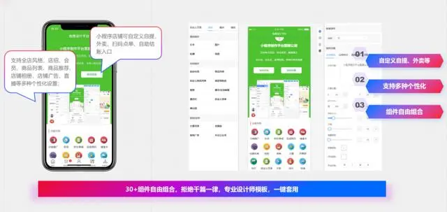 03. 自定義裝修:??在商家小程序端支持自定義裝修,內(nèi)嵌30+個(gè)組件自由組合,可自定義到店自提、自營(yíng)外賣、會(huì)員儲(chǔ)值、新品輪播等,個(gè)性化組件一鍵套用。