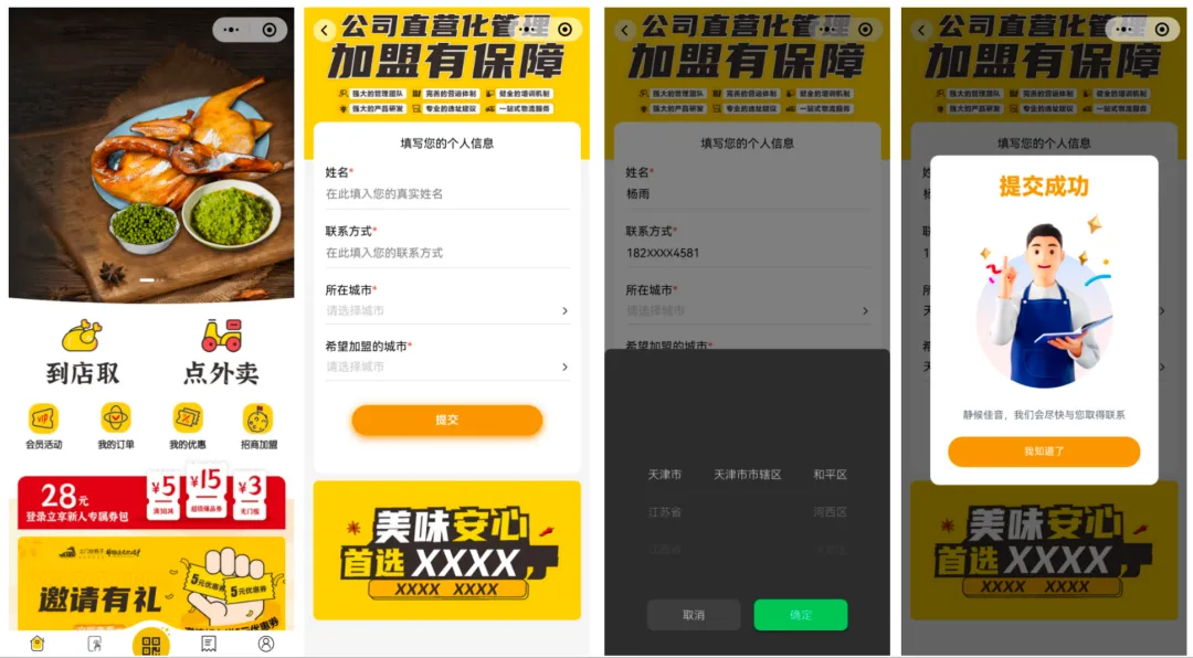 商家小程序端支持裝修招商加盟入口及頁面,用戶可填寫意向信息并且提交,總部招商部門進行線索管理、流轉、導出等能力。