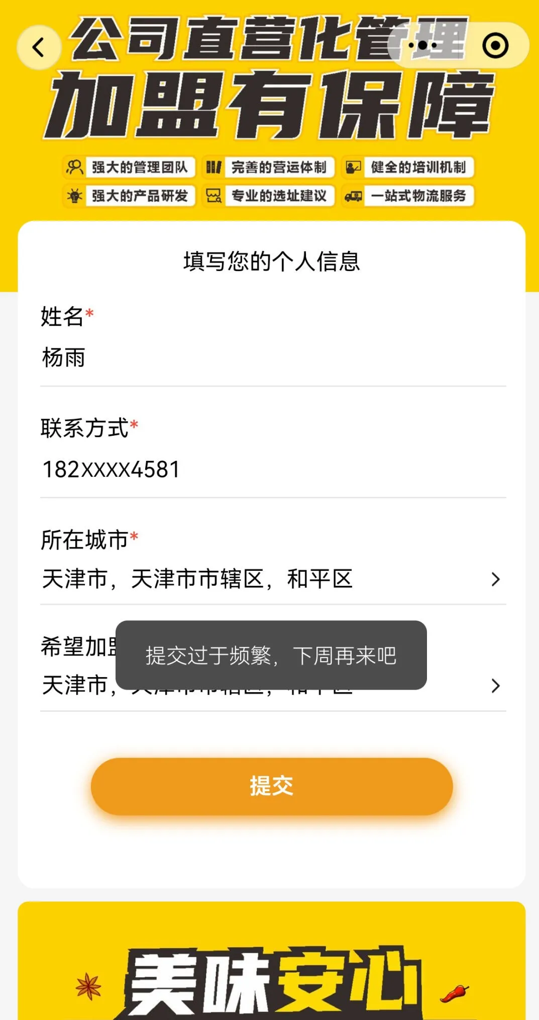 品牌連鎖店招商加盟日趨競爭激烈的數智化行業,為防止品牌商家同行惡意競爭填寫資料,惡意擾亂招商秩序。客如云智享版餐飲管理系統全新招商加盟功能,做了用戶提交次數的風控規則的限制。