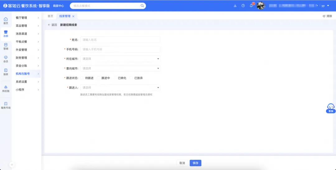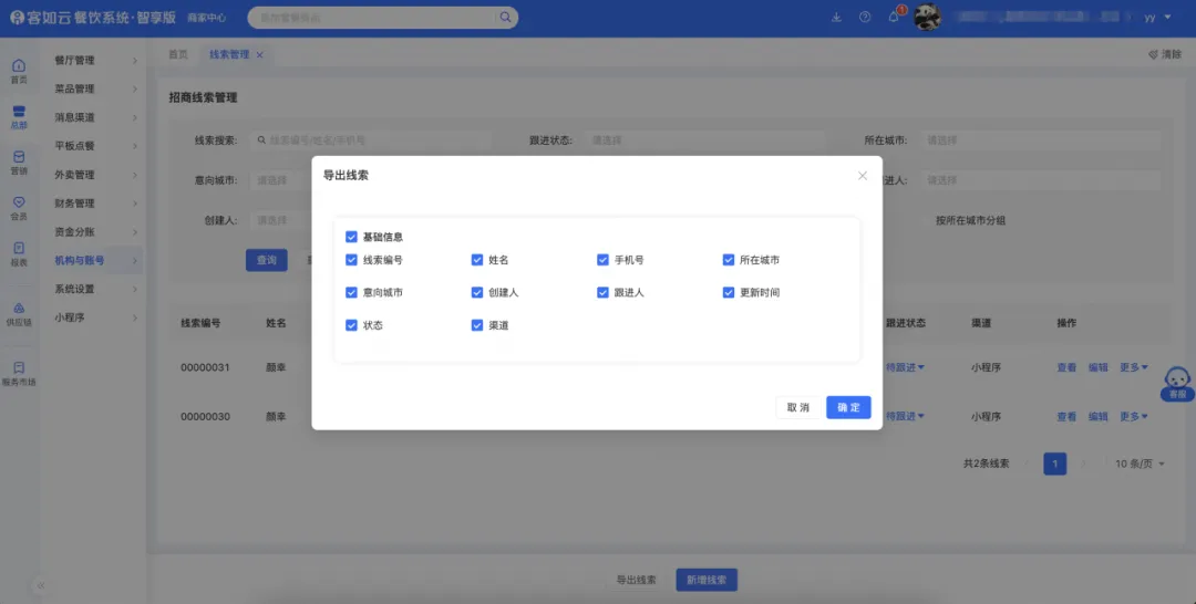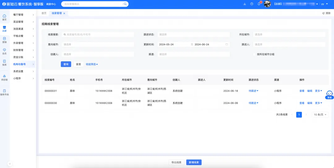 品牌連鎖商家們,可在客如云智享版餐飲管理系統中的商家后臺,管理用戶提交的招商加盟線索信息,可視化系統分類管理匯總,方便招商人員業務跟進與檢索。