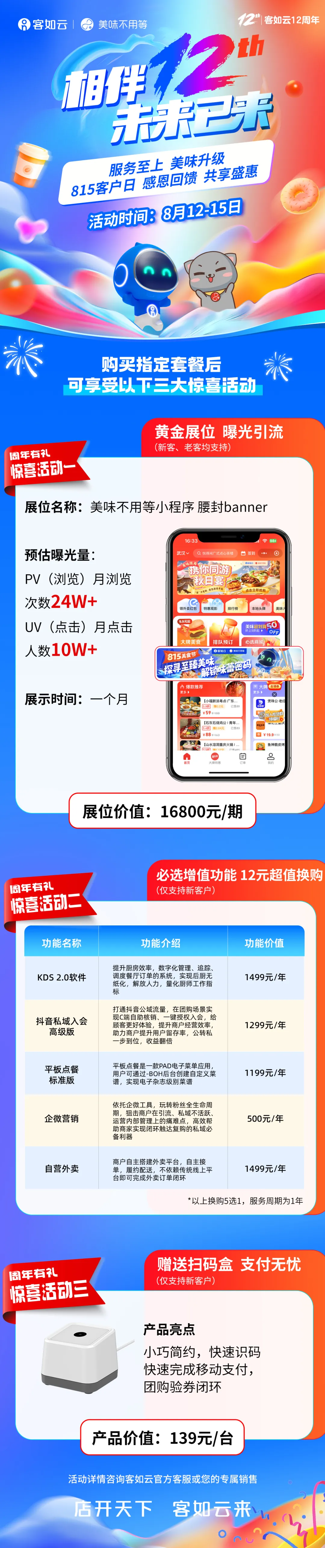 服務至上,美味升級。值此十二周年之際,客如云特別推出了“815客戶日”優(yōu)惠活動,回饋新老客戶多年來的關注與信任,共同見證并慶祝這一里程碑時刻,助力帶動更多餐飲商家踏上數(shù)智化新征程。